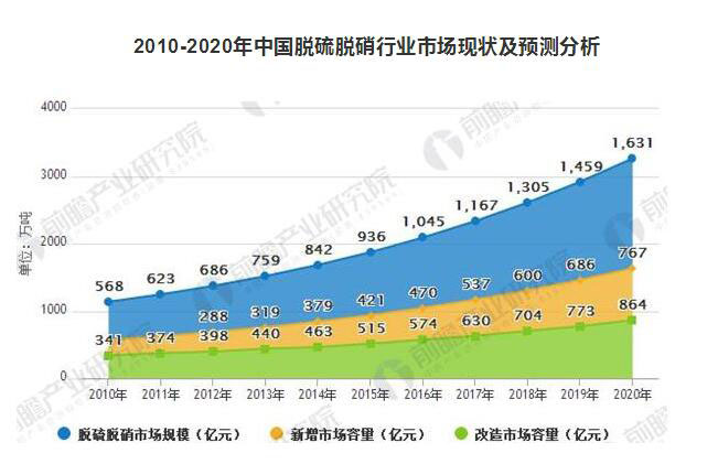當前,煙氣除塵、脫硫、脫硝是大氣污染治理的三大業務板塊,據前瞻產業研究院發布的《大氣污染治理行業市場前瞻與投資戰略規劃分析報告》統計數據顯示,2015年,我國脫硫脫硝行業需求規模超過900億元,其中新增市場容量超過400億元,改造市場容量超過500億元,且隨著國家大氣污染法規標準越來越嚴格,未來5-10年將是中國大氣污染治理的重點時期,市場容量將繼續保持在10%左右的增幅。