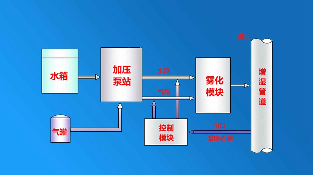 系統(tǒng)結(jié)構(gòu):該系統(tǒng)霧化噴槍固定在增濕塔錐體部位,整套設(shè)備由四部分構(gòu)成:一是壓縮空氣供應(yīng)系統(tǒng),與主排風(fēng)機(jī)相連接;二是加壓供水系統(tǒng)。由立式多級離心泵帶電機(jī)和整套精密低壓閥門、過濾器等附件組成;三是增濕塔頂部霧化系統(tǒng)。由增濕塔頂部環(huán)管、噴槍、噴嘴、高壓伸縮軟管及精密閥門、過濾器等連接件組成。四是多功能控制系統(tǒng)。由氣、水壓力、溫度、流量測控器,低壓元器件和變頻器等組成完整閉路控制系統(tǒng)。