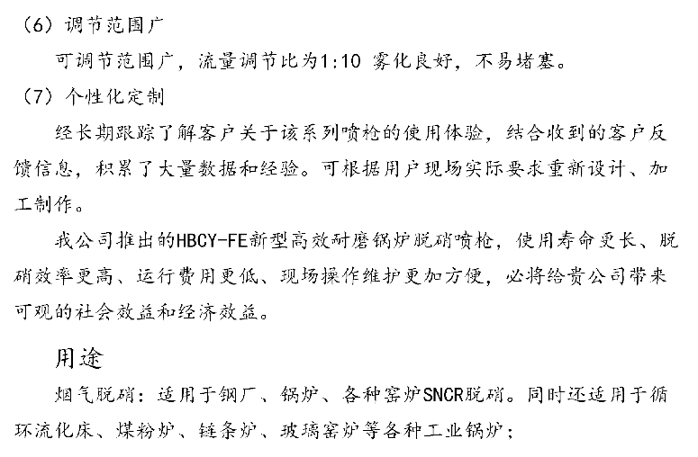 HBCY-FE型高效脫硝噴槍是整套脫硝系統的核心部件之一,噴槍性能和質量,對整套脫硝設備脫硝率、運行成本、氨逃逸等起著決定性作用。